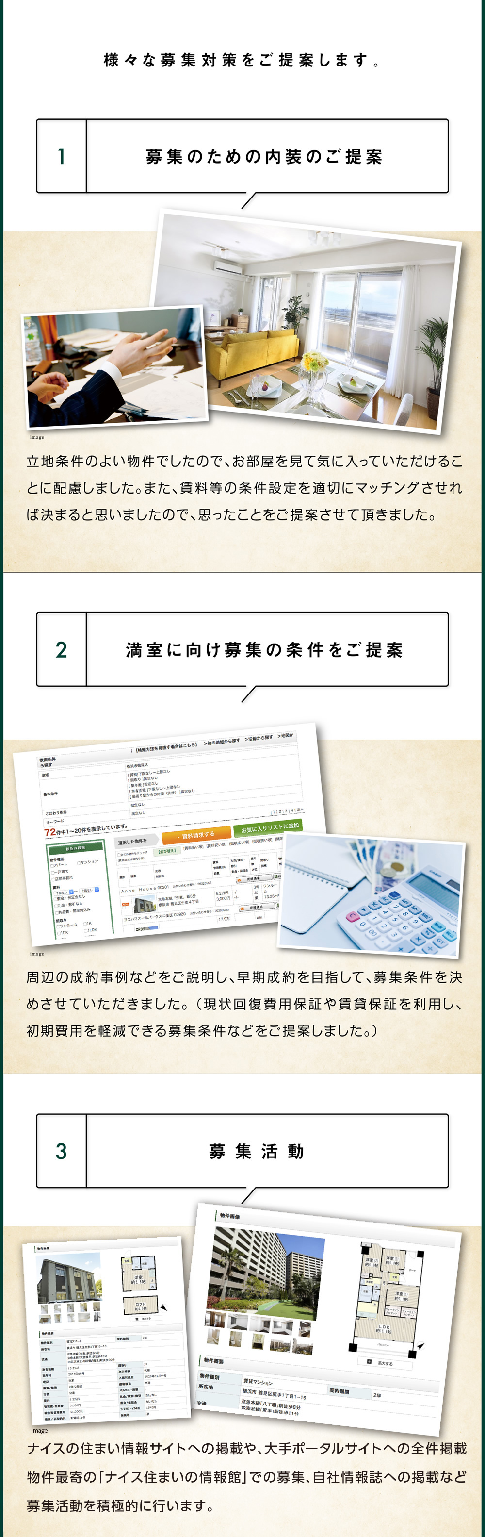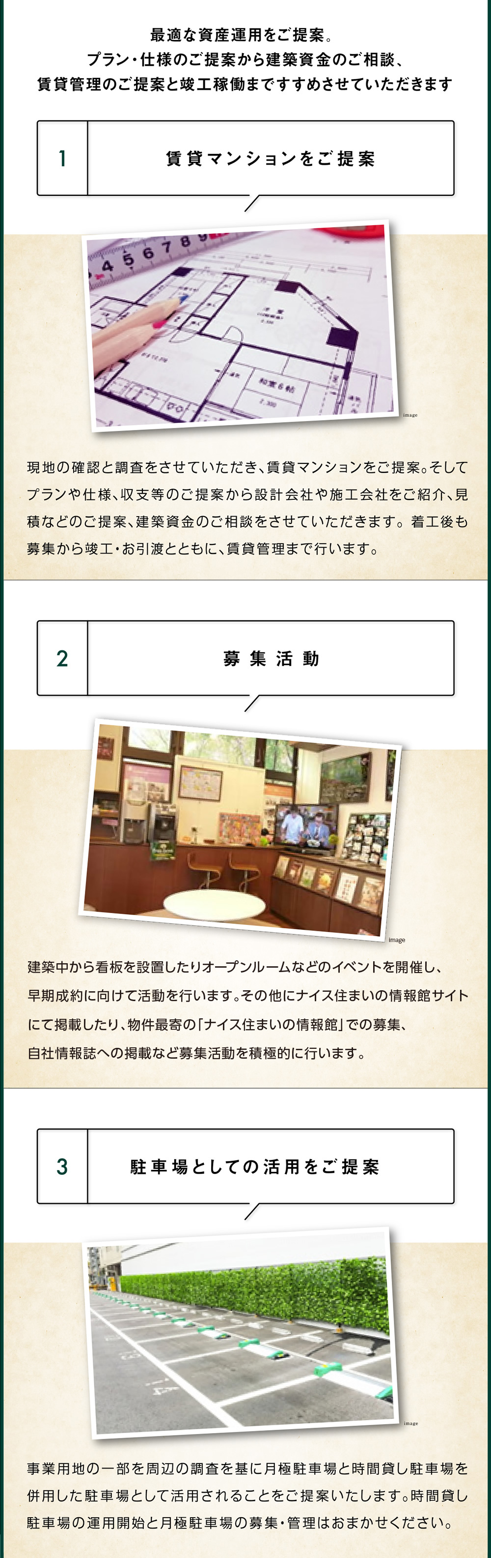 また、直近の賃貸動向、相場変遷も理解しており、お客様がいつから貸したいか?等のご賃貸事情とマーケットの状況を鑑みた最適な販売戦略を立案させていただきます。
